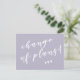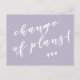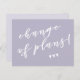 NewParkLane - Cartão-postal, com 'Mudança de Planos' em elegantes scripts de pincel branco/tipografia de caligrafia e três pequenos corações bonitos, em um fundo de lavanda. Um cartão multifunções para informar as pessoas de que houve um adiamento de uma data partidária devido à Pandemia de Corona ou por outras razões. Fácil de personalizar no Zazzle, adicionando seu próprio texto ou mudando a cor de fundo de um design personalizado. Veja esta coleção para itens correspondentes! Você tem desejos pessoais específicos de design? Sinta-se livre para me contactar!