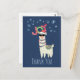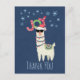Obrigado de festa de Natal que você faz cartão postal. Projetado com uma ilustração engraçada. Uma lhama bonita vestindo óculos escuros e um chapéu de Papai Noel vermelho. Também vestindo um cobertor sul-americano chamado "pom-poms". A palavra Joy escrita sobre sua cabeça em uma fonte festiva colorida. Flocos de neve azuis caindo. Colocado sobre um fundo azul. Design de Natal maravilhoso e divertido. Mensagem atrás que você pode personalizar.