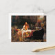 Cartão postal com a pintura a óleo de John William Waterhouse The Lady of Shalott (1888). Uma bela mulher de vestido branco escapa num barco do seu destino olhar para todo o mundo através de um espelho e tecer uma tapeçaria dele — mas ao ver o Príncipe Lancelot, a maldição segue a Senhora de Shalott até ao seu fim. As cores brilhantes do outono pintam esta cena trágica. Um presente inspirador para os entusiastas de Arthuriana e os coletores de pré-raphaelite.