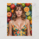 Uma bela mulher num biquíni impressão cítrico com uma colagem de frutas ao fundo A gerou arte retrô