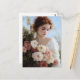 Uma pintura de óleo texturizada, ao estilo de vintage, de uma mulher elegante com cabelo castanho encharcado numa simples parte, olhando para longe de um buquê de flores em um momento de reflexão silenciosa.