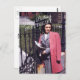 Uma mulher adorável de 1946 parada do lado de fora num cartão-postal vermelho de casaco.