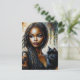 Cartão postal apresenta trabalho de arte de uma linda mulher de pele castanha segurando um gato preto. Retrato do estilo de pintura de óleo de um dono de animais melanizado com um pouco de vibração. Arte de Dee Claire.