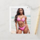 Este postal mostra uma imagem fotográfica de um belo modelo de maiô da diáspora africana. Ela tem cabelos compridos e veste um biquíni rosa enquanto se coloca na praia com o oceano atrás. A expressão dela é um pouco sorrateira. Imagem estética de verão do excelente para qualquer hora!