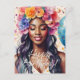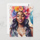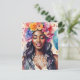 Este cartão postal colorido apresenta uma mulher negra linda e sorridente usando uma coroa floral, cercada por confetes. Um balão azul e as palavras 'Feliz Aniversário' unem tudo em uma saudação festiva de aniversário! Celebre a menina de aniversário melanizada mágica em sua vida com este cartão postal de festa multicolorido.