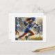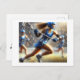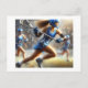 Um jogador de lacrosse de uniforme azul está correndo energicamente em um campo, segurando um bastão de lacrosse enquanto os colegas se movem ao fundo. A cena é animada, capturando a intensidade e velocidade do jogo.