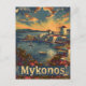 Um retrato sereno e nostálgico de Mykonos, a icônica ilha grega conhecida por seus prédios lavados em branco e domos azuis vibrantes. O design captura as visões litorâneas pitorescas da ilha, ruas charmosas e a beleza eterno de sua arquitetura, todas ilustradas no estilo antigo. Este trabalho de arte incorpora o relaxado e ensopado charme de Mykonos, convidando os espectadores a experimentar seu único fascínio.