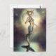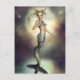 Uma sereia loira com uma cauda brilhante de verde e amarelo está em frente a uma lua de cheio sobre um fundo místico acima da água do oceano. Aproveite!