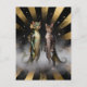 Two fantastical creatures with dragon-like scales stand amid swirling mist. Their cat-like features add a whimsical touch, set against a dramatic backdrop of gold and black rays.