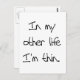 Um design de texto engraçado para quem quer que esteja lutando para o peso do perder, diz: "Na minha outra vida sou magra." T-shirts, ímanes, botões, sacos de tote, garrafas de água, cartões, autocolantes, correntes-chave, canecas e muito mais!