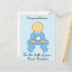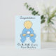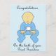 Um adorável menino de desenho animado vestido de azul e as palavras "Parabéns sobre o nascimento do seu Excelente neto".