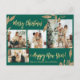 O Elegante, Moderno Dourado e Verde Folheto de 4 Fotos Colagem Feliz Cartão-Postal de Natal. Este festivo, mimalista, cômico, quatro (4) modelo de cartões postais fotográficos, apresenta uma bonito colagem fotográfica, folhas botânicas de folha de ouro, winterberry e diz Feliz Natal e Feliz ano novo! O texto de saudação de "Feliz Natal e Feliz ano novo" é escrito em um belo tipo de letra tipográfica manuscrito em verde-floresta escuro, ou fundo verde-esmeralda. Bonito manutenção para sua família e amigos nesta época de Natal e Férias.