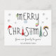 Envie para sua família e amigos este lindo cartão postal icônico de Natal de 2020 neste feriado. Com o texto 'FELIZ NATAL' com imagens icônicas de Natal e covid19, uma mensagem pessoal e o nome da família. O verso do cartão postal tem um modelo de texto que diz 'QUE ANO!, Uma pandemia mundial, ensino domiciliar, trabalho em casa, isolamento, máscaras faciais, desinfetante para as mãos, compras em pânico, falta de rolos de papel higiênico, proteção, bloqueio, quarentena, licença, perda de empregos, perda de vidas, hospitais lotados, aplausos nas ruas, pacotes de alimentos, comer fora para ajudar, consultas médicas online, compras online, covid-19, coronavírus, o mundo mudou. Mas ainda estamos aqui, desejando a todos um Feliz Natal e Ano Novo! com amor, Amanda, Anthony, Charlotte, Stephan & Adam.' O endereço de devolução é disposto na linha do meio do cartão. Todo o texto e modelos podem ser facilmente