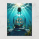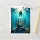 Um postal marítimo com um navio numa garrafa sentada no fundo do mar com raios solares a descer. Um cartão postal agradável para dizer oi e manter contato com um amigo ou familiar.