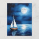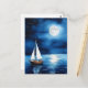 Cartão-postal em uma ilustração de um veleiro flutuando pacificamente em um mar calmo e iluminado, cercado por um céu noturno estrelado. A lua de cheio lança uma reflexão suave sobre a água, criando uma cena serena e tranquila.