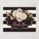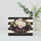 Este cartão de agradecimento para chá de noiva combina com a coleção de convites de chá de noiva mostrada abaixo e apresenta um padrão de listras horizontais largas em preto e marfim com uma caixa de texto decorativa em forma de colchete preto com duas bordas douradas externas. Há um grande buquê floral colorido no centro superior do cartão postal, com lindas rosas em creme, marfim e rosa, com lírios peruanos laranja e folhagem verde. A parte de trás do cartão é marfim e tem uma pequena borda inferior preta com uma faixa dourada simulada ao longo da largura do cartão. Outro pequeno buquê floral está no canto inferior direito. O cartão é deixado em branco para que você escreva à mão uma mensagem de agradecimento, mas você também pode adicionar uma mensagem de agradecimento pré-impressa ou outro texto, se preferir. É uma maneira perfeita de encerrar seu chá de no