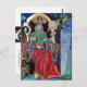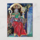 Pintura colorida, vibrante e contemporânea em cores dourada, azul, vermelha, verde, castanha. Um misterioso feiticeiro hipnótico com fantasias elegantes de veludo vermelho segurando uma esfera mágica sentada num trono gótico com gargantas e coruja. Ambiente é surreal, fantástico, alquímico onde você vê um jester é bebendo de uma xícara, um monge templar voando sobre um sapo, bolhas transparentes, paisagens de fantasia com fogo infernal, céu azul cósmico com estrelas, montanhas do céu, árvores .Egg Tempera em um painel de madeira com ouro. 1989, Miniatura feita com técnicas pictoriais de 1300 por Alessandro Lumini (c)