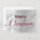 Este cartão-postal de Natal apresenta uma elegante saudação à frente, com a palavra "Feliz" a vermelho e rodeada de pele branca, um brilhante "Natal" em brilho vermelho e faíscas, todas cercadas por neve branca e brilho prateado (impressas) para replicar a queda da neve.