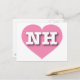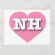 Este cartão-postal apresenta um coração cor-de-rosa vibrante contendo as letras maiúsculas, brancas e em negrito NH, a abreviação oficial de New Hampshire, o estado granito. O reverso do cartão postal é vazio, aguardando seu texto personalizado ou sentimentos escritos à mão.
