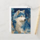 This ethereal postcard features a majestic wolf with white and cerulean blue fur, looking thoughtfully to the side. The artwork is characterized by intricate, feather-like linework throughout the wolf's coat, set against a star-studded midnight indigo background. Surrounded by vibrant blue blossoms and tall, golden wheat-like stalks, the piece creates a serene and mystical atmosphere. The rich palette of navy, sapphire, and cream provides a sophisticated, artistic vibe. As a postcard, it is perfect for sending a soulful message or as a unique piece of miniature wall art for nature and wildlife enthusiasts.