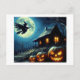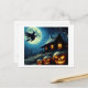 Uma bruxa voa sobre uma vassoura através de uma lua de cheio luminosa, lançando um brilho estranho sobre uma casa assustadora e três abóboras esculpidas. O cenário é completado com morcegos voando ao fundo e árvores nuas abençoadas contra o céu noturno.
