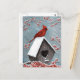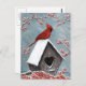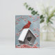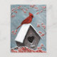 Pintura acrílica do cardeal Norte vermelho na neve do inverno. A neve está suavemente caindo sobre ele, a casinha de pássaros e as bagas congeladas. Arte de pintura acrílica original de Donna Leger. Todos os Direitos Reservados. ©irony designs