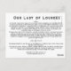 Nossa Senhora da Fátima Oração do Cartão-Postal Seja abençoada, A Virgem mais pura, por ter garantido que você brilha com vida, doçura e beleza, no Grotto de Lourdes, dizendo para a criança, Rua. Bernadette: 'Eu sou a Conceição Imaculada.' Mil vezes o felicitamos pela sua concepção imaculada. E agora, O nunca imaculada Virgem, Mãe do compaixão, Saúde dos doentes, Refúgio de pecadores, Comforter dos afligidos, vocês conhecem nossos desejos, nossos problemas, nossos sofrimentos: projetar nos mostrar um olhar de compaixão. Ao aparecerem no Grotto de Lourdes, vocês ficaram felizes em fazer dele um santuário privilegiado, onde dispensam seus favores, e já muitos conseguiram a cura de suas enfermidades, tanto espirituais quanto físicas. Por conseguinte, somos os que têm mais confiança para implorar a sua intercessão materna. Obtenha para nós, Ó amável Mãe, a concessão do nosso pedido. (diga seu pedido) Graças à gratidão por seus favores, tentaremos imitar suas virtudes, que um dia poderemos compartilhar sua glória. Nossa Senhora de Lourdes, Mãe do Cristo, você teve influência com seu filho divino enquanto estava na Terra. Você tem a mesma influência agora no céu. Rezem por nós; obtenham-nos do vosso Divino Filho os nossos pedidos especiais se for a Vontade Divina. Amém. Nossa Senhora de Lourdes, reze por nós. Santo Bernadette, reze por nós.