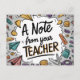 Brilhe o dia dos seus alunos com este cartão postal colorido e divertido! Perfeito para a escola primária, este cartão postal 'A Note from Your Teacher' é ideal para voltar às saudações escolares, ou para uma nota positiva. Os professores podem usar este design educacional e engajador para dar boas-vindas aos estudantes de uma forma memorável. Apresentando material escolar lúdico e uma ilustração de maçã, é perfeito para todas as idades. Adicione uma mensagem pessoal nas costas para fazer cada aluno se sentir especial. Excelente maneira de os professores desenvolverem relacionamentos ou apenas compartilharem o progresso dos alunos.