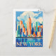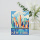 Uma ilustração vibrante e colorida de um famoso horizonte urbano, com arranha-céus e marcos icônicos. A imagem captura a energia dinâmica e a grandeza arquitetônica da cidade, com seus prédios torrenciais e ruas movimentadas. O estilo geral é ousado e gráfico, com foco no horizonte icônico da cidade.