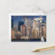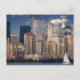 Foto fabulosa do horizonte de Nova Iorque à noite. A imagem tem um barco à vela na frente d'água, no primeiro plano, e o fundo é povoado com os muitos e interessantes arranha-céus brilhantes e brilhantes e edifícios. A foto foi tirada ao anoitecer quando o céu da noite tem uma sensação de crepúsculo.