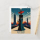 Descubra a beleza de "Nova York: Terra de Maravilhas Naturais" com este lindo cartão-postal de viagem! Este encantador cartão-postal de viagem apresenta uma mulher elegante de vestido longo e chapéu de abas largas, elegantemente posicionada em uma ponte enquanto contempla a icônica silhueta da cidade de Nova York. Carros antigos adicionam um toque nostálgico, enquanto o céu azul profundo, adornado com estrelas e elementos celestes, infunde a cena com glamour. Esta obra de arte captura lindamente o espírito vibrante e o charme atemporal do estado, tornando-o uma homenagem perfeita à magia e ao charme de Nova York.