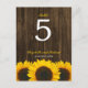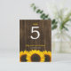 Um número da mesa de núpcias com o tema do país, com girassóis amarelos sobre um fundo de madeira marrom-escuro rústico. Altere o número de cada mesa necessária e adicione um de cada vez ao carrinho.