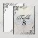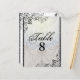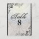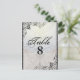 Cartão-postal do Chandelier Elegante e Flourish Table Number. O rico floresce ao embelezar as bordas enquanto um pano de fundo opalescente com um candelabro completa esta placa de número de tabela de excelente para a sua recepção de casamento.