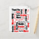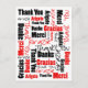 Envie uma mensagem de cartão postal única com este Obrigado em vermelho e preto escrito em vários idiomas e uma variedade de estilos de fonte sobre o branco. Clique em Personalizar! para adicionar texto no verso ou deixe em branco para uma mensagem manuscrita. No personalizar, você pode selecionar uma cor de fundo diferente do branco para a frente e verso.