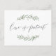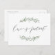 Cartões postais modernos de adiamento do casamento - "O amor é paciente" -, caligrafia e design verde de folhagem com cor d'água rústica, simples e elegante, informem aos convidados do casamento a informação atualizada com este anúncio. Ver todas as peças correspondentes na coleção
