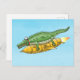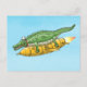 O crocodilo verde voa alto no céu usando seu foguete de ouro rápido.