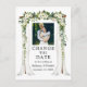 Vestido Elegante Canopy Watercolor Green Floral Mudança A Data de Adiamento de Casamento Novo Cartão de Casamento inclui peões brancos . O arco da copa do casamento da madeira inclui vegetação botânica. Foto do casal.