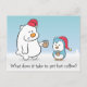Um belo desenho de Natal onde um urso polar que está segurando uma caneca gelada reclama do pinguim azul. A legenda "O que é preciso para conseguir café quente por aqui?" Os problemas engraçados de ficar no polo norte frio - sem café quente!!! As duas personagens parecem absolutamente adoráveis com suas bonés de Natal. Também, você notou as árvores no fundo da neve? Uma design de Natal alegre e humorística para amigos, familiares e amantes de café! Design por Rusty Doodle.