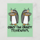 Obedeça aos pinguins loucos! - Dois pinguins de desenho animado engraçados com uma frase boba / citação com um fundo verde.