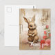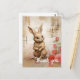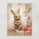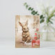 Um coelho fofo fica de pé sobre as patas traseiras em meio a um pano de fundo de respingos e gotas abstratas, com uma expressão suave no rosto. Ao lado do coelho, um grupo de rosas cor-de-rosa adiciona um toque de cor ao ambiente em tons sépia.