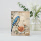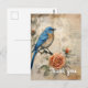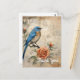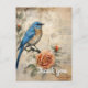 Um pássaro azul vibrante está empoleirado graciosamente em um galho com uma rosa em flor, apresentando uma interação de beleza natural contra um fundo de escrita à mão e tons sépia. A obra de arte combina elementos de técnicas de aquarela e desenho para criar uma imagem que tem qualidades vintage e realistas.