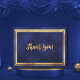 Um cartão de agradecimento para um aniversário marcante. Uma cor de fundo azul marinho escuro e uma moldura dourada falsa. A cor azul é irregular. Na frente, um estilo de letra à mão e o texto: Obrigado!