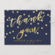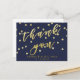 NewParkLane - Cartão postal elegante, com 'Obrigado' em tipografia elegante de folha de ouro falsa, contra um fundo azul-marinho com confetes dourados. Fácil de personalizar no Zazzle com seus próprios nomes, data ou outro texto para um design personalizado. Todo o estilo de texto, cores e tamanhos podem ser modificados para atender às suas necessidades. Você também pode alterar a cor do fundo para qualquer cor que preferir.