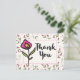 Um obrigado de festa que você faz com cartão postal com "Obrigado" e um bonito quadro quadrado de dentro de flor rosa com uma borda rosa. O fundo é um padrão com flores silvestres cor-de-rosa desenhadas à mão, com caules longos e folhas verdes sobre um fundo branco de casca-de-ovo. Círculos cor-de-rosa e galhos também decoram o design. O verso tem seu nome pessoal e obrigado que você envia com um padrão de flor fraco atrás do texto. Design floral branco e bonito.