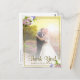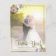 Este cartão bonito agradecerá a seus convidados sendo uma parte de sua celebração do casamento. Caracteriza um design floral pastel com sua foto cercada por um quadro delicado do ouro com um buquê das flores do primavera que incluem rosas cor-de-rosa, o hydrangea roxo, e as orquídeas & os lírios de calla brancos nos cantos. A parte traseira tem o espaço para você escrever uma nota pessoal e um endereço do remetente impresso.