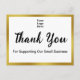 Frente: Há uma imagem de exibição na parte superior que você pode substituir pelo seu logotipo. Obrigado Você aparece em um grande roteiro preto. Uma linha de texto de exibição está abaixo do obrigado. Você pode editar esse texto para mostrar uma mensagem personalizada, se desejar. (Mostrado: para apoiar nossa pequena empresa) A frente também tem uma borda falsa (não de papel) de ouro. Traseiro: a parte traseira tem 6 linhas de texto preto. Você pode editar ou excluir o texto para criar uma mensagem personalizada para seu público.