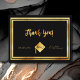Um cartão de agradecimento para o graduado. Uma cor de fundo preta e uma moldura dourada falsa. Na frente, uma fonte estilo letra à mão e o texto: Obrigado! Graduado 2023 (ou qualquer ano) e um chapéu de formatura. Costas: Modelo para seu bilhete de agradecimento e nome. Sem cor de fundo.