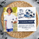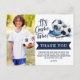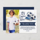 Cartão postal de agradecimento moderno, desportivo e dinâmico para o aniversário de crianças que jogam futebol, perfeito para jovens entusiastas do futebol. O design apresenta tipografia com a frase "é hora do jogo", ilustração em aquarela com uma bola de futebol e sapatos em cores azuis da moda, foto única e mensagem de agradecimento em letras em negrito. Com recursos editáveis, você pode personalizar facilmente o cartão postal de agradecimento com o nome e a mensagem do seu filho ou texto adicional.