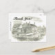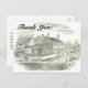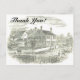 Este design de cartão postal de agradecimento apresenta a mensagem "Obrigado!" e uma ilustração de uma casa antiga na frente. O verso apresenta uma mensagem personalizada.