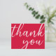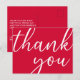 Um fundo vibrante vermelho cereja. Na parte da frente, grande letra manuscrita com o texto: Obrigado. Verso: Modelo para o seu bilhete de agradecimento e nome/nomes. Dica: Se você não quiser que pareça um cartão postal, clique em personalizar, vá para trás e remova o divisor e o selo postal.